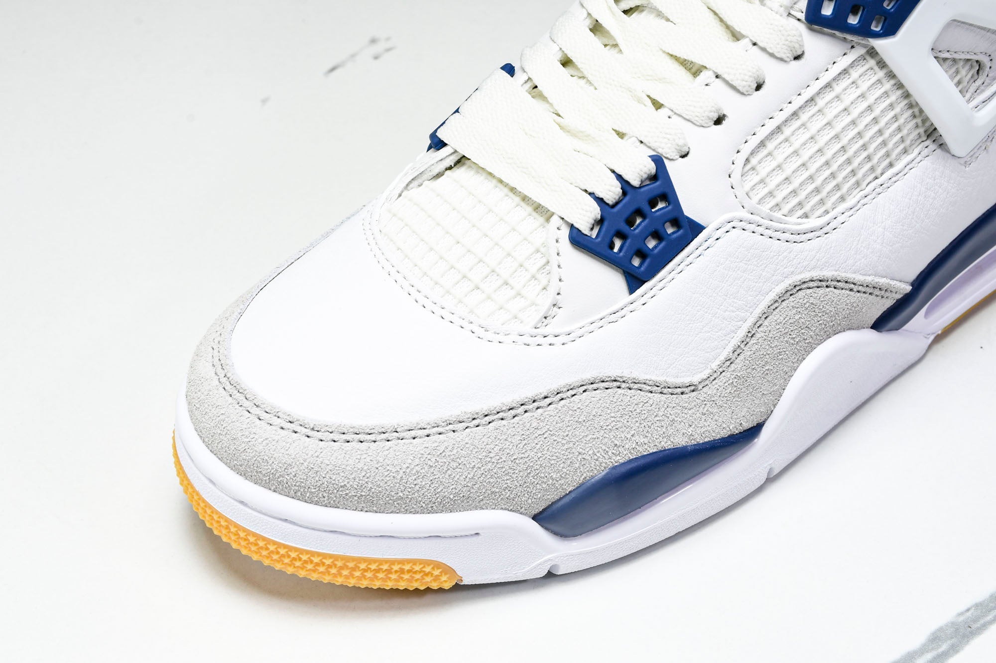 The AJ4 Retro SB ‘Navy’ builds on the success of the “Pine Green” release, blending classic J design with skateboarding enhancements. The Summit White leather upper is accented with deep navy hits on the eyelets, heel tab, and midsole, while a red J logo adds a bold contrast. NK SB branding on the heel and a gum yellow outsole reinforce its skate-ready functionality, offering improved grip and durability. With a retooled sole for better board feel and impact protection, this AJ4 seamlessly merges style and performance.