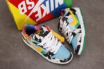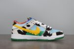 This SB Dnk Low is composed of a cloudy blue sky and green meadow leather upper with faux cowhide on the overlays and tongues. Yellow logos on the side resemble melting ice cream with leather protruding the standard pattern in a drip-like fashion. Tie-dye interiors, Ben & Jerry’s style branding on the heel tab, and a white and green sole completes the design.