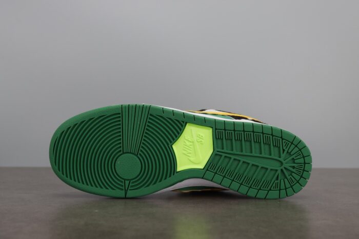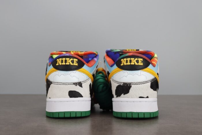 This SB Dnk Low is composed of a cloudy blue sky and green meadow leather upper with faux cowhide on the overlays and tongues. Yellow logos on the side resemble melting ice cream with leather protruding the standard pattern in a drip-like fashion. Tie-dye interiors, Ben & Jerry’s style branding on the heel tab, and a white and green sole completes the design.