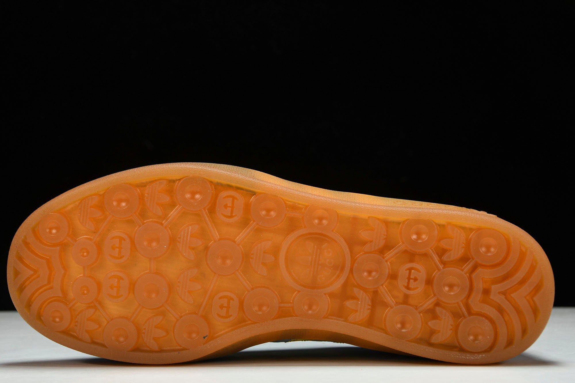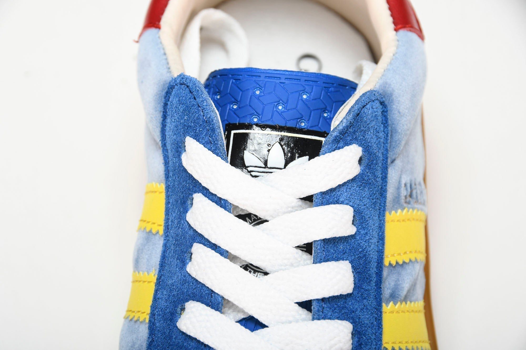 Guссi venture into a collection, where the web juxtaposes with the three white stripes, and the GG monogram combines with the trifoil. Pulling inspiration from the creative directors memories of the ‘80s and ‘90s, emblematic house motifs mix with those of the historic sportswear brand AD resulting in a series of hybrid looks. These light blue suede GG canvas gazelle sneakers have the Guссi trifoil print.