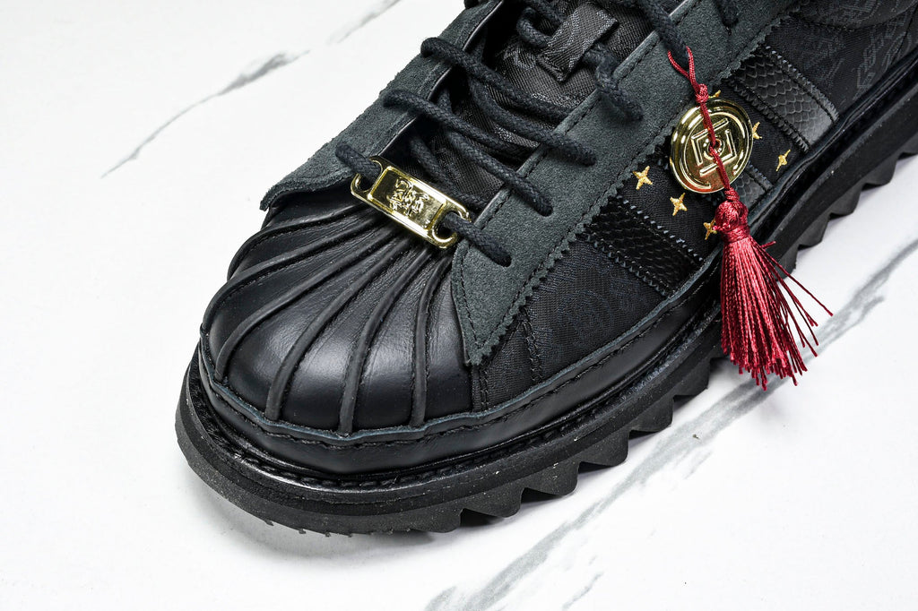 AD and Edison Chen continue their partnership with the Superstar x CLOT by Edison Chen ‘Lunar New Year’, a bold take on the classic silhouette for Chinese New Year. Fire-red tassels add a festive flair, complemented by gilded details on a textured mix of croc leather, sheer synthetics, and suede. Departing from past patent leather versions, this edition embraces a traditional aesthetic while retaining signature elements like the iconic shell toe and ripple sole.This unique blend of heritage and innovation makes it a standout addition to the ongoing CLOT x AD collaboration.