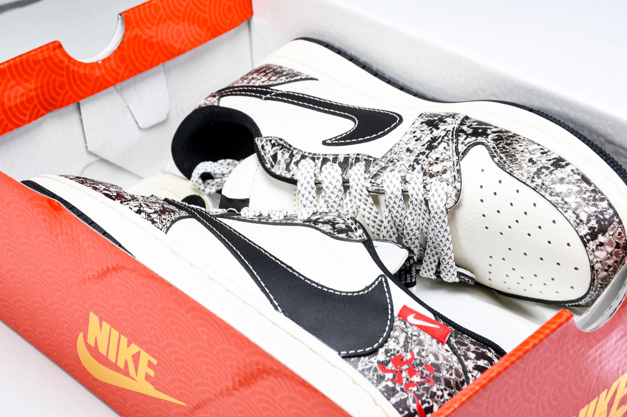 Drip Locker is here to make your impossible fantasy collaborations a reality – bringing together iconic brands in a series of custom creations that sneakerheads could only dream of. These unreleased Travis Scott AJ1 Retro Low x Year of The Snake sneakers offer an exclusive fusion of streetwear icons, blending the Travis Scott AJ1 Low design with distinctive Chinese New Year branding. Featuring unique premium materials and the signature reverse check, these sneakers showcase a one-of-a-kind look that elevates any collection